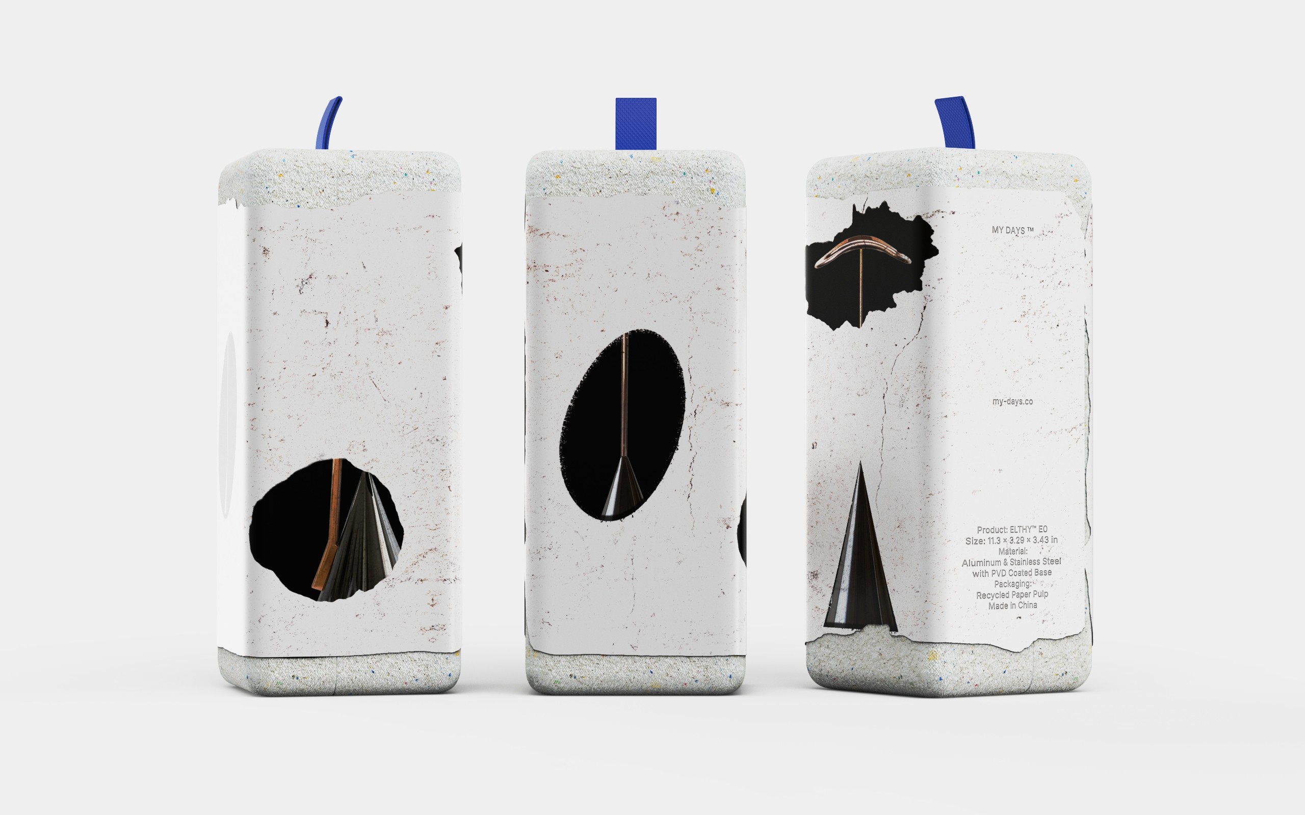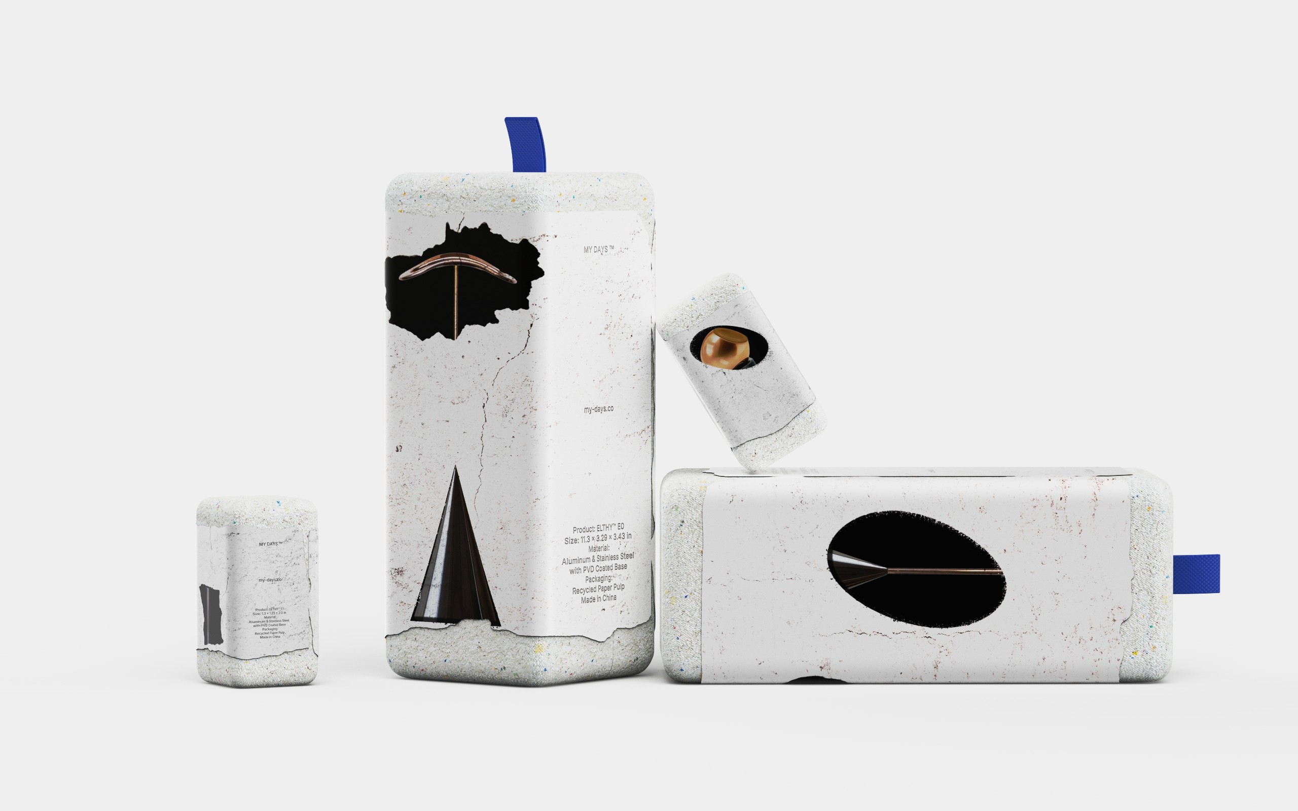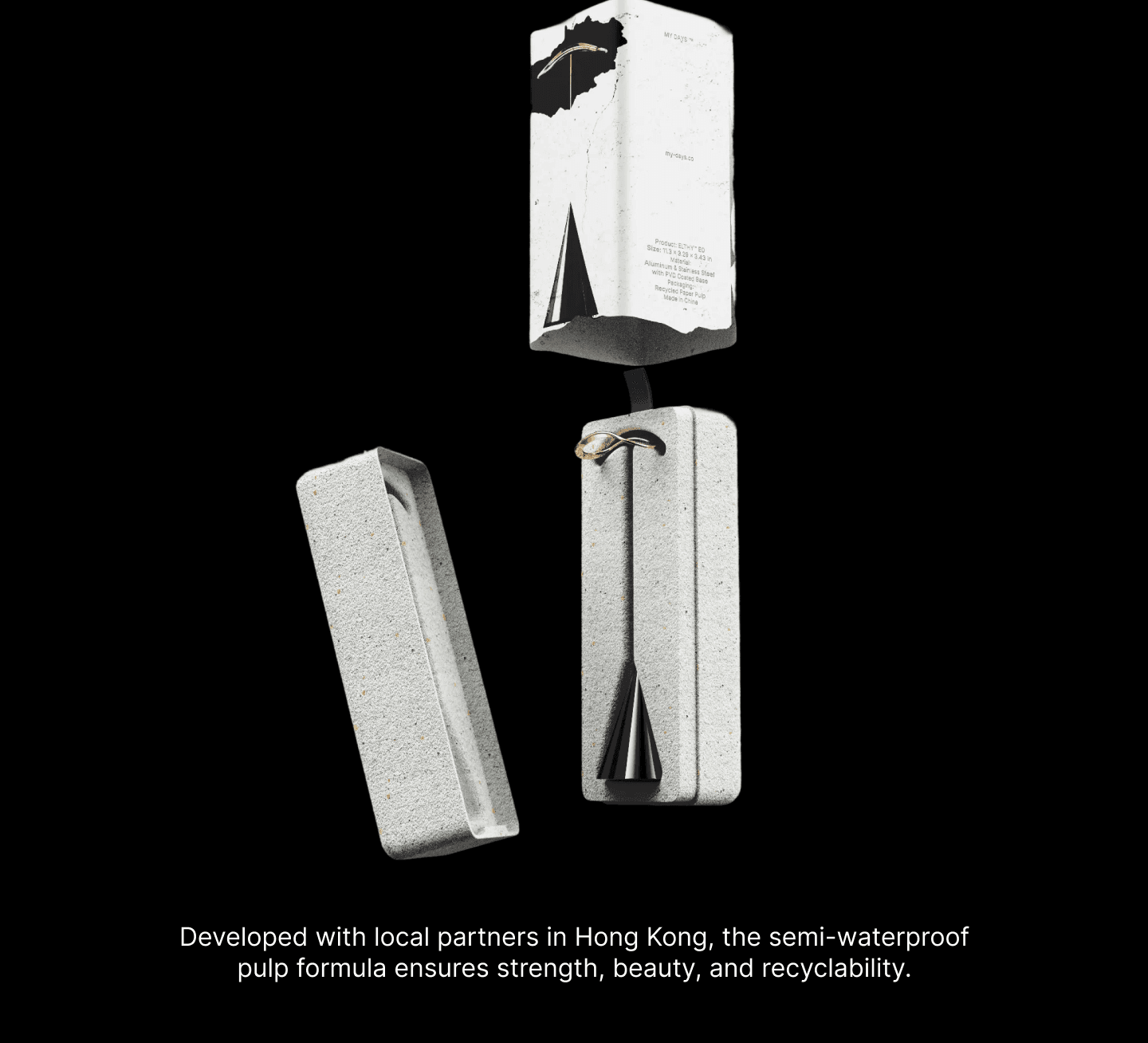 The Elthy™ Series packaging is designed to embody the brand vision — a playground for adults. It experiments with bold material ideas using recycled paper pulp as the core structure, forming both its tactile and symbolic character. The design embraces sustainability as an expression of luxury — bringing technology accessories and timeless craftsmanship into a new dialogue that feels fresh, artful, and enduring.